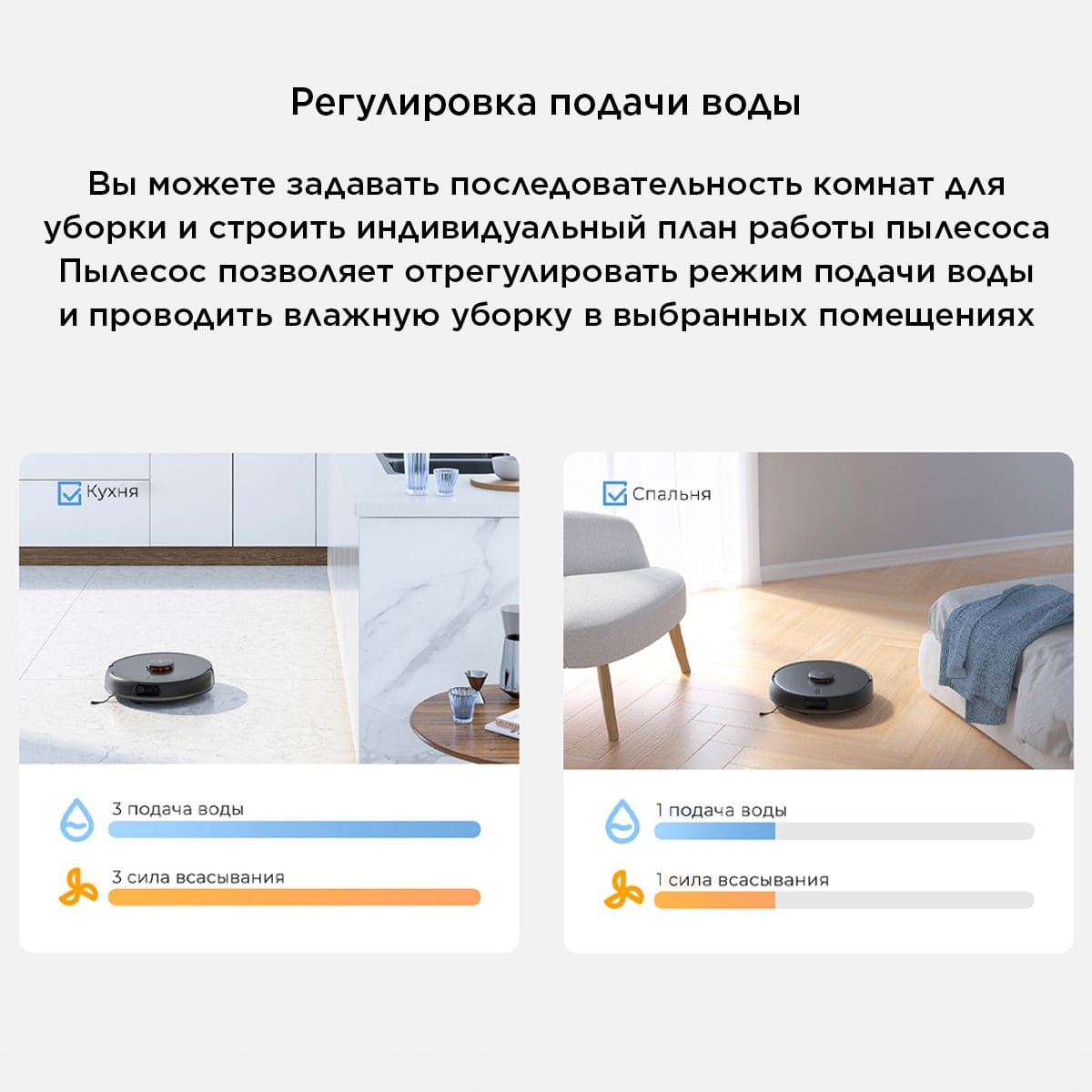 Вы можете самостоятельно задавать последовательность комнат для уборки и строить индивидуальный план работы пылесоса. Кроме этого, пылесос позволяет отрегулировать режим подачи воды и проводить влажную уборку только тех комнат, которые Вы указали.
