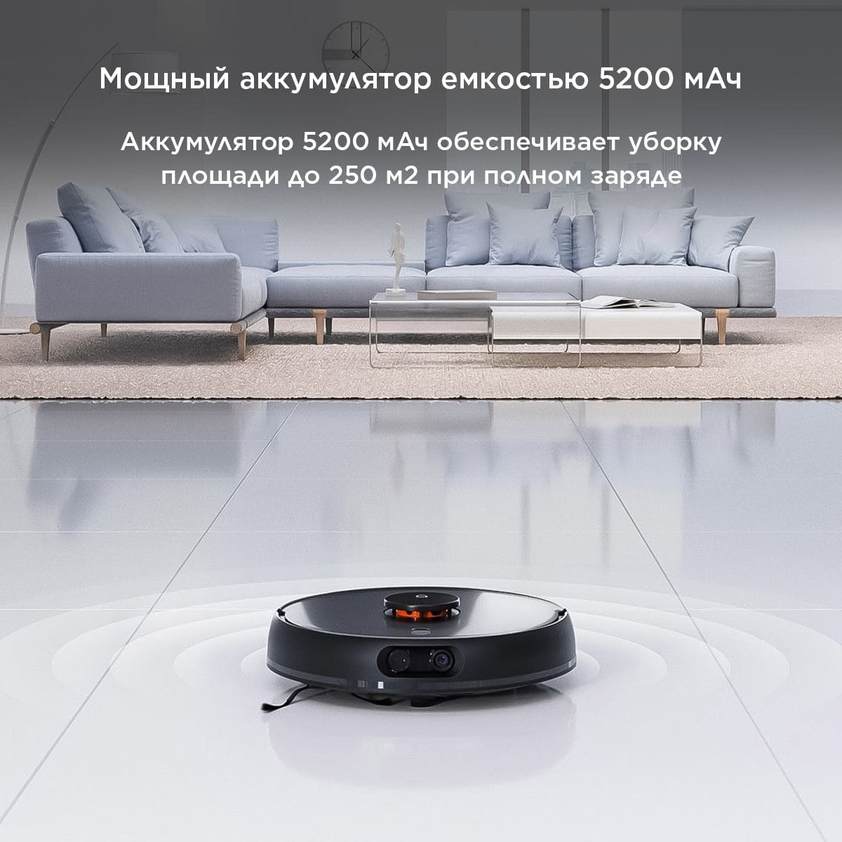 Встроенный аккумулятор емкостью 5200 мАч обеспечивает уборку площади до 250 м2 без необходимости дополнительной подзарядки.