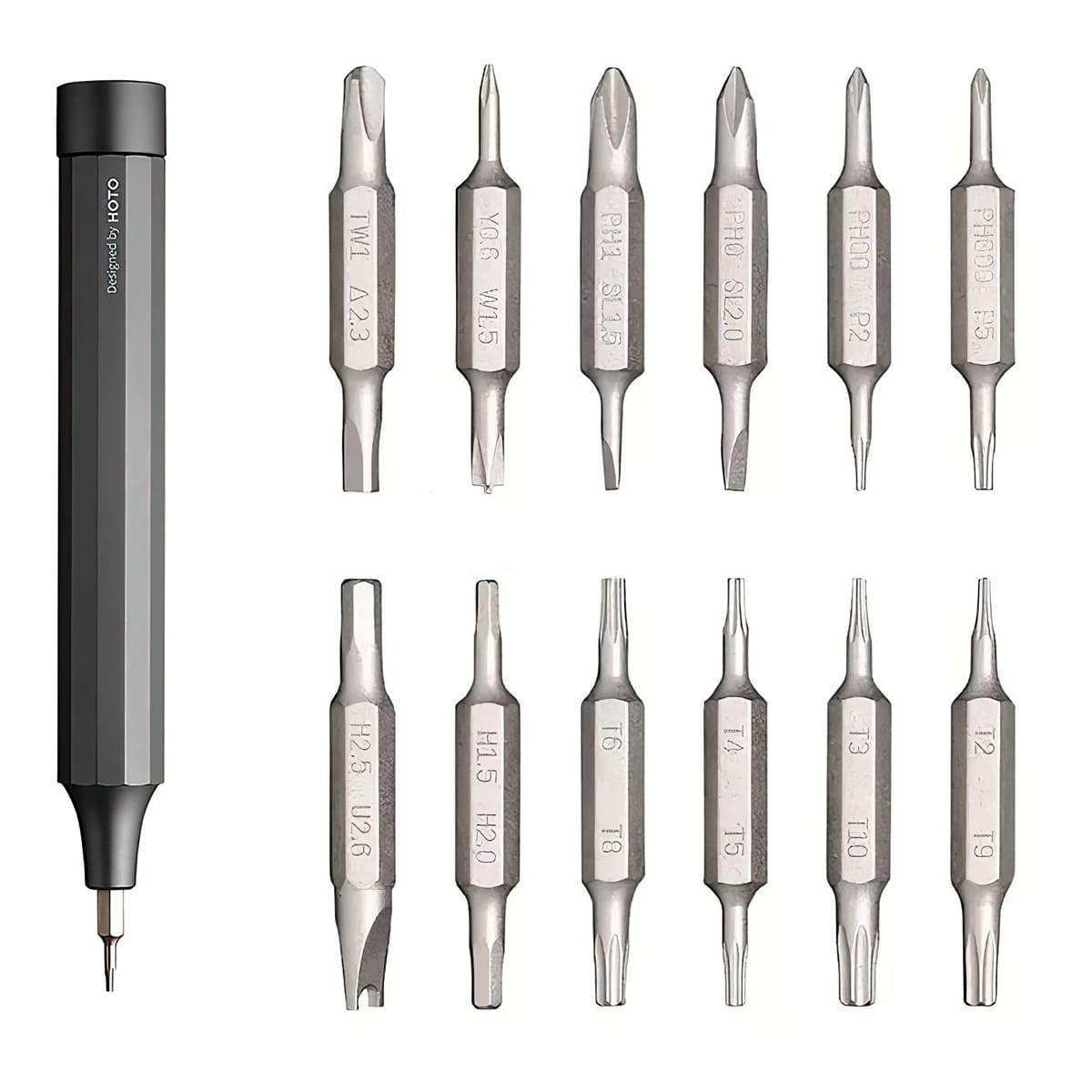 Ручная отвертка с набором бит. В комплект включены даже редко используемые шлицы, благодаря чему отвертка станет полезной во многих ситуациях (разборка часов, очков, телефона, геймпада, ноутбука и прочее). Корпус из алюминиевого сплава многогранный полый. Внутри на магнитах хранятся биты. Биты изготовлены из высококачественной стали марки S2 твердостью 60HRC.